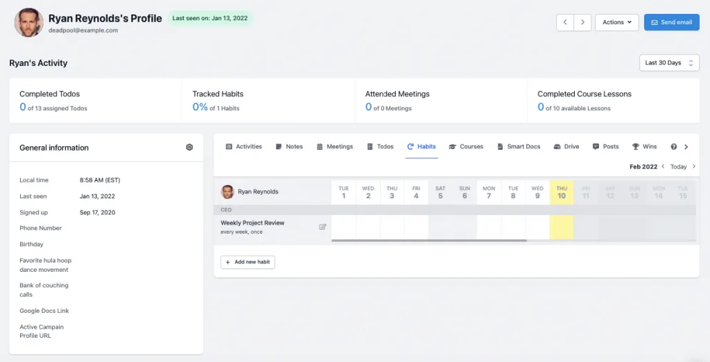 In addition to the smart documents feature, upcoach also hosts a robust student CRM that provides not only personal details and contact information, but also a detailed overview of completed to-dos and where they may be falling behind. Again, if you reach out to students the minute you see them struggling, overall course satisfaction will dramatically increase.